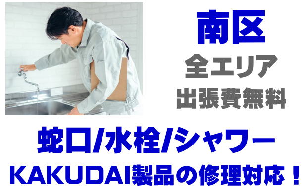 南区で水栓メーカーKAKUDAIの修理業者をお探しなら当社までお気軽にお問い合わせください。蛇口の水漏れ、シャワーの故障などカクダイ製に関するトラブルなら何でもご相談ください。